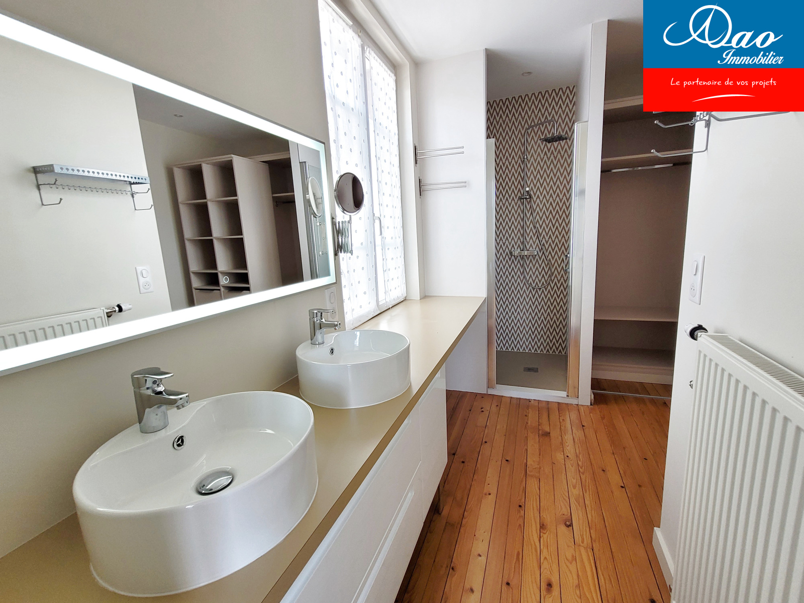 Elle est composée d'une entrée, cuisine ouverte aménagée et équipée (four, plaque, hotte, frigo, lave-vaisselle) sur salon-salle à manger donnant sur une terrasse; un bureau, WC. A l'étage, un palier desservant une suite parentale (chambre, salle de douche, WC)